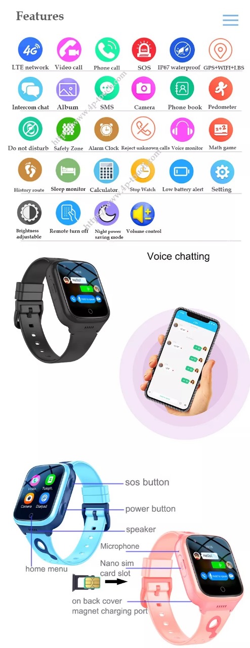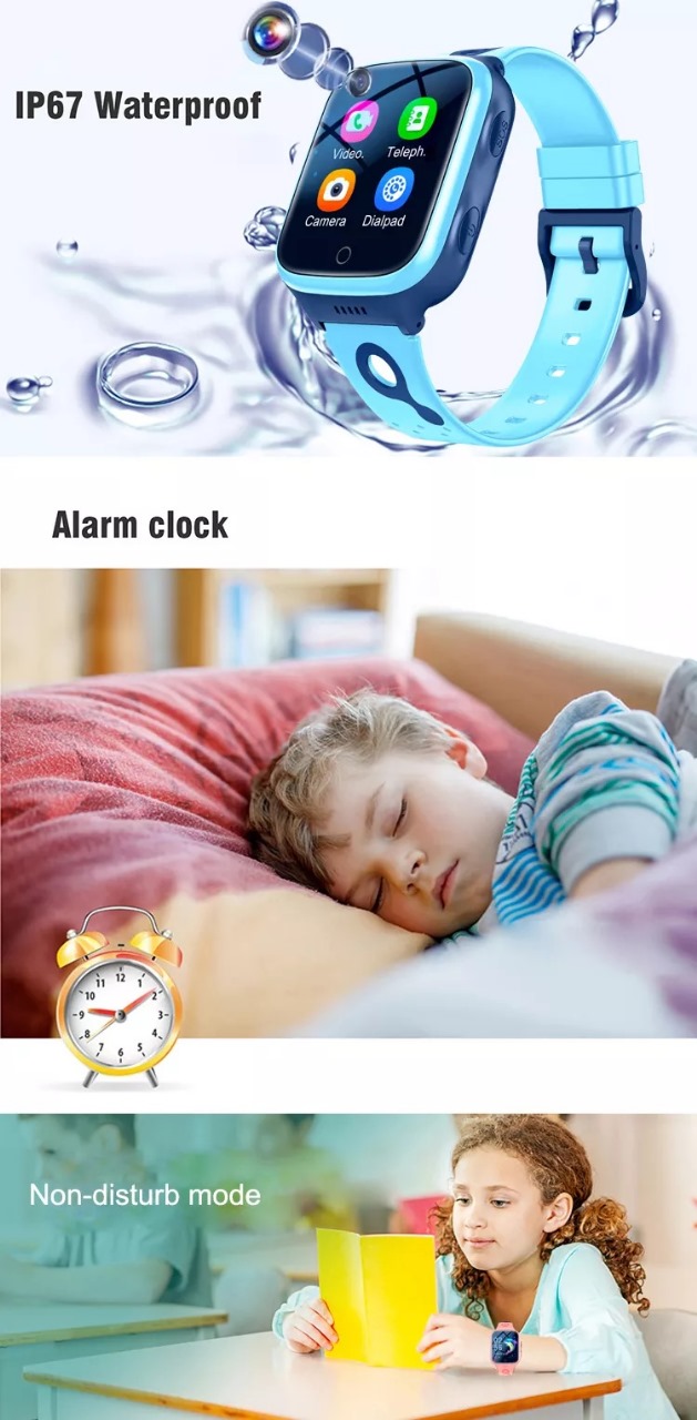 Stay connected with 4G connectivity. Your child can make a phone or video call directly from their wrist, keeping communication effortless and convenient. This is not just a watch but a powerful safety companion for your child. With advanced features like 4G connectivity phone and video call capabilities, SOS function, waterproof design, GPS tracking, and more. This smartwatch offers unmatched protection and peace of mind. The waterproof GPS Tracker Watch with Geo-fence offers: Video call Two-way communication SOS panic button Voice remote monitoring Reject unknown calls Voice chat/Intercom chatting Phone book/Contacts Remote Photo IP67 waterproof Real-time Google Maps location and History Route Alarm clock Pedometer, Calories & Sleep monitoring Do not disturb mode (when in class) Support 4G/3G/2G network Support GPS + Wi-Fi hotspots + LBS positioning Math game/Stopwatch/Calculator SMS alerts Time display Switch dial clock Volume/Brightness adjustable Geo-fence/Safety Zone Multi-languages Remote shutdown/Remote restart 1-meter length Magnetic charging cable (avoid short circuit IC Free app platform for a lifetime